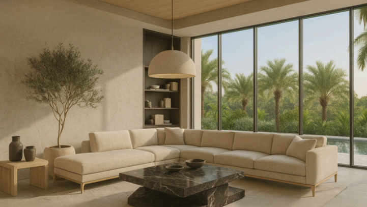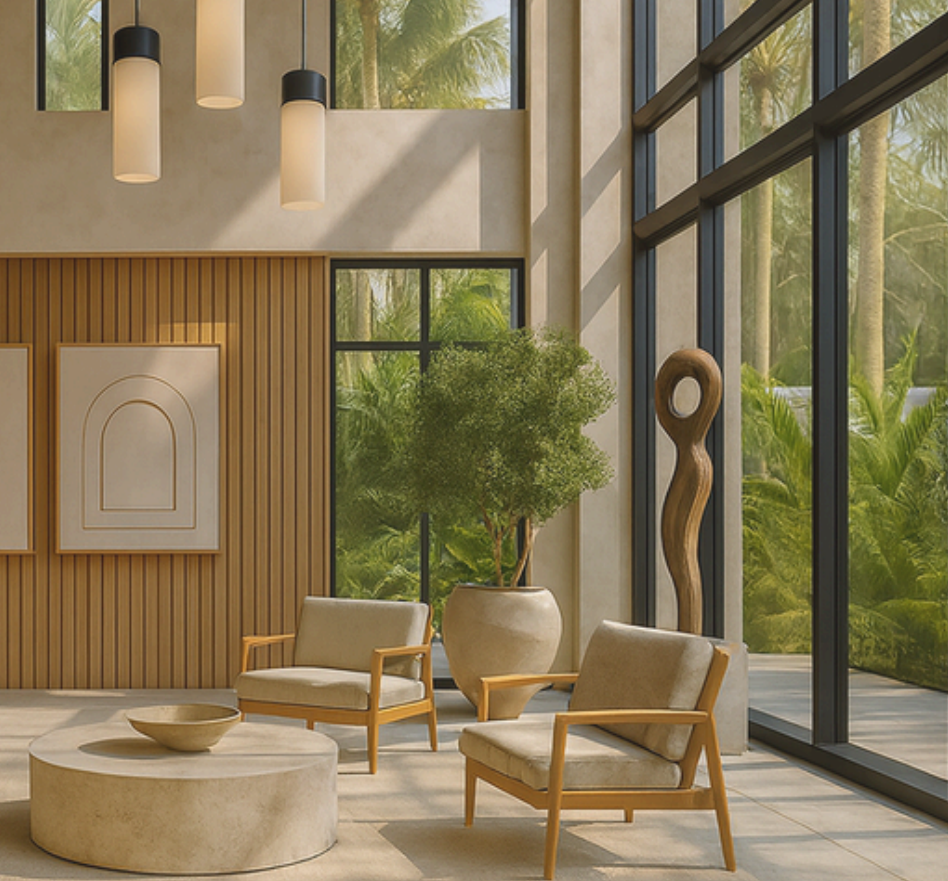 ❋ Refined Natural MaterialsPale timbers, natural stone, soft porcelains, and linen textures combine to form a warm, elegant palette inspired by early morning coastal light.